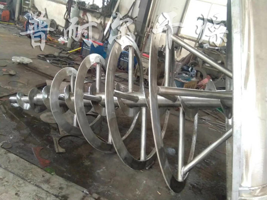 羧甲基纤维锂螺带真空干燥机是一种利用螺带将物料旋转提升及圆锥夹套、空心螺带内同时通入传热介质(如热水、导热油、蒸汽等),使加热后物料从四周提升并从中间下落,快速不断的循环翻转,并通过筒体内抽真空将水汽及时带走, 使物料在短时间内达到干燥和混合目的。与传统的立式混合机相比,筒体内无任何传动机构,从根本上杜绝因润滑油泄漏而导致物料污染,运行可靠稳定,特别适宜卫生要求高的粉料、颗粒混合;同时也适用于粘性流体或稠状、湿状为主物料的搅拌混合;与其它卧式干燥机相比,具有出料方便,可以100%完全出料,操作、维修方便。它的干燥效率是同等规格“双锥回转真空干燥机”3-5倍。