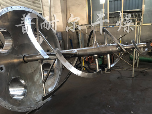 羧甲基纤维锂螺带真空干燥机是一种利用螺带将物料旋转提升及圆锥夹套、空心螺带内同时通入传热介质(如热水、导热油、蒸汽等),使加热后物料从四周提升并从中间下落,快速不断的循环翻转,并通过筒体内抽真空将水汽及时带走, 使物料在短时间内达到干燥和混合目的。与传统的立式混合机相比,筒体内无任何传动机构,从根本上杜绝因润滑油泄漏而导致物料污染,运行可靠稳定,特别适宜卫生要求高的粉料、颗粒混合;同时也适用于粘性流体或稠状、湿状为主物料的搅拌混合;与其它卧式干燥机相比,具有出料方便,可以100%完全出料,操作、维修方便。它的干燥效率是同等规格“双锥回转真空干燥机”3-5倍。