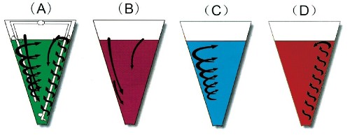 混合机由两只非对称螺旋的快速自转,物料向上提升,形成两股非对称沿筒壁由下向上的螺旋物料流(见下图A、B)。转臂带动的螺旋公转运动,使螺旋外的物料不同程度进入螺柱包络线内,一部分物料被错位提升,另一部分物料被抛出螺柱,从而达到全圆周方位物料的不断更新扩散,被提到上部的两股物料再向中心凹穴汇合,形成一股向下的物料流,补充了底部的空穴,从而形成对流循环。(见下图C、D)由于上述运动的反复,物料在较短的时间内获得了均匀混合,混合程度较高。