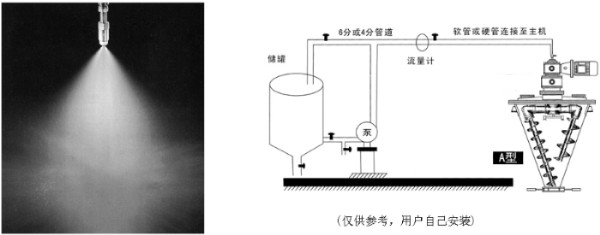 混合过程中需要添加液体时,液体由旋转接头输入,经过管路、喷头、均匀喷洒在筒体内运动的物料中,见下图,此装置如需配套,外加价订货时说明。